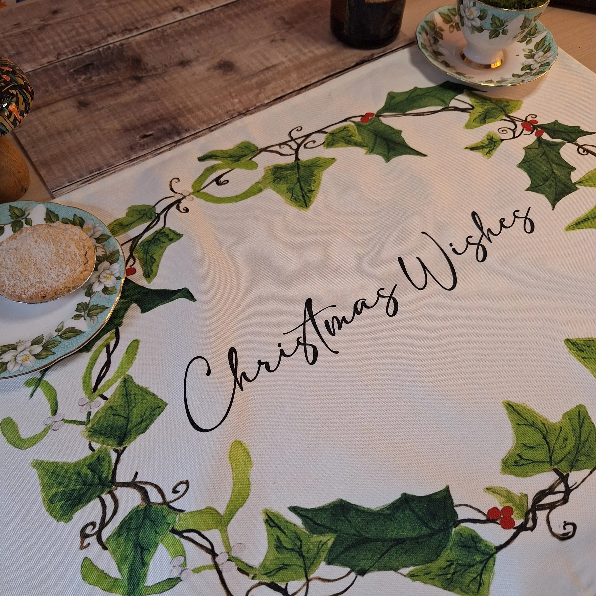 A stunningly festive Tea Towel perfect for your Christmas cooking and baking. A wreath consisting of the traditional Christmas plants of Holly, Ivy and Mistletoe, which makes it perfect to have out during the entire festive season.